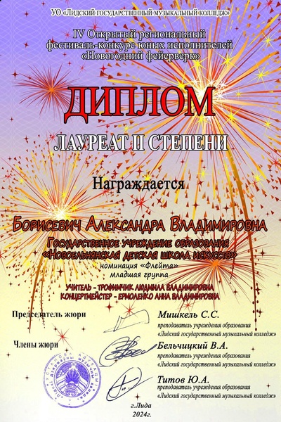 Дипломант 1 степени: Маркевич Матвей, кларне, учитель Жданюк Ю.Н., концертмейстер Мякшило Г.Н.